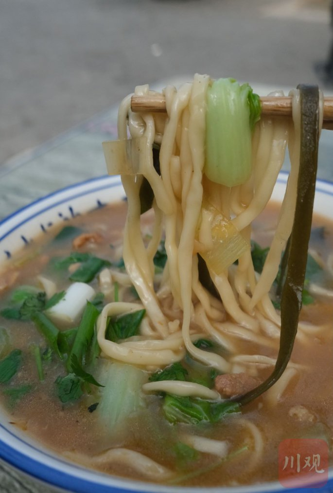 甜水面被称为四川小吃中的“男子汉”,筷子般粗壮的面条硬朗、坚韧,两三根就能装满一碗。
