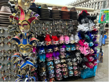 纪念品中,特别是面具,在威尼斯最受欢迎。最近正巧是威尼斯的狂欢节,这个节日最早可追溯到1294年,也是源于威尼斯,是欧洲最重要的节日之一,它吸引了来自世界各地的游客参与其中。在狂欢节期间,当地人和游客会穿上各式各样的服装和面具,庆祝这个古老的传统节日。这种文化盛事对于提升当地的旅游吸引力和经济活力有着重要作用。
