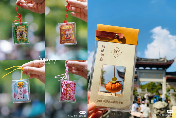 再比如,南京鸡鸣寺的柿柿如意香囊,与杭州的法喜寺护身符,都设计得小巧又可爱,让人想买回来戴在身上。