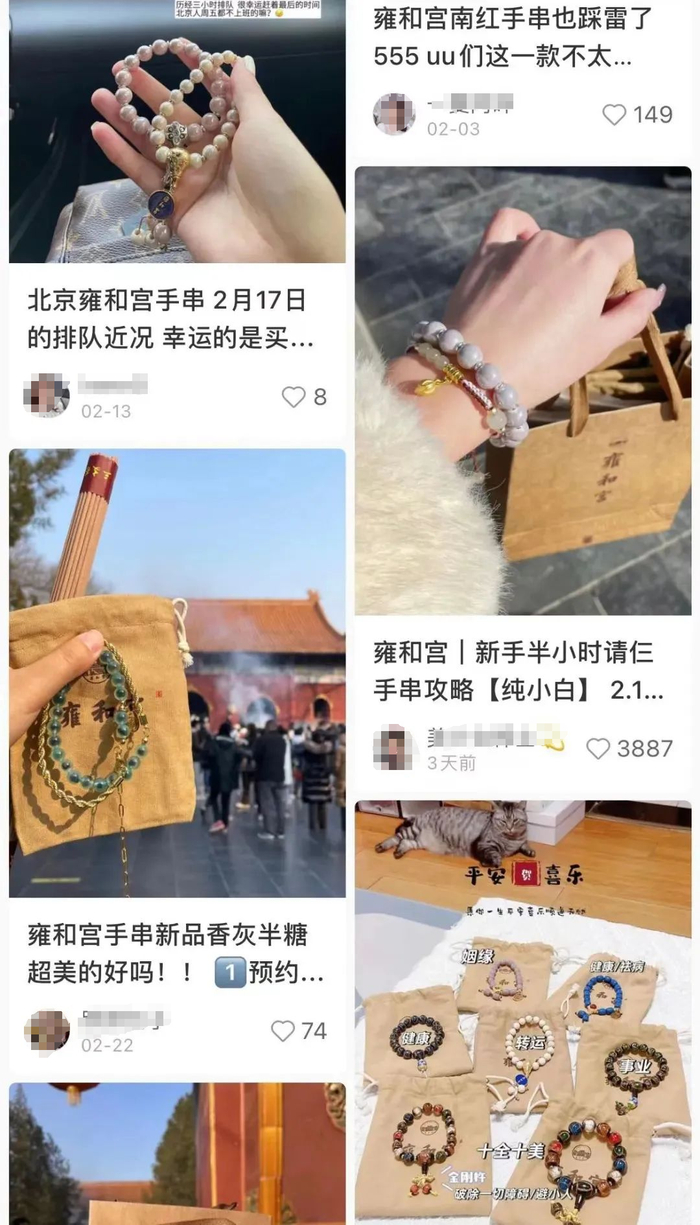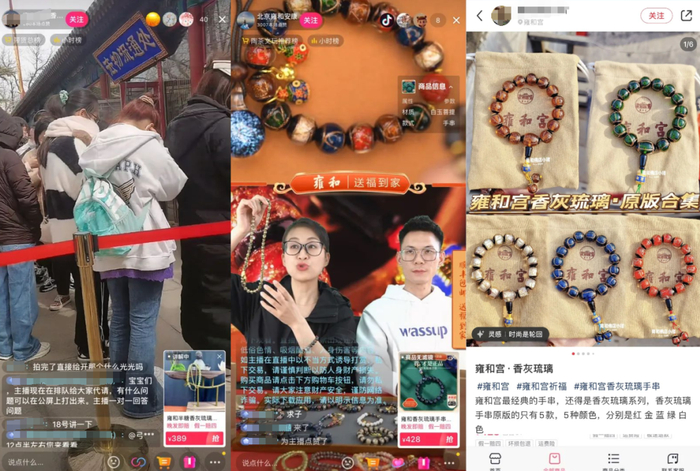 在抖音直播间和小红书都有很多“雍和XXXX”的店,白天直播在法物流通处现场购买手串和开光,晚上有主播和观众聊天叫卖手串,实现了线上拓展。