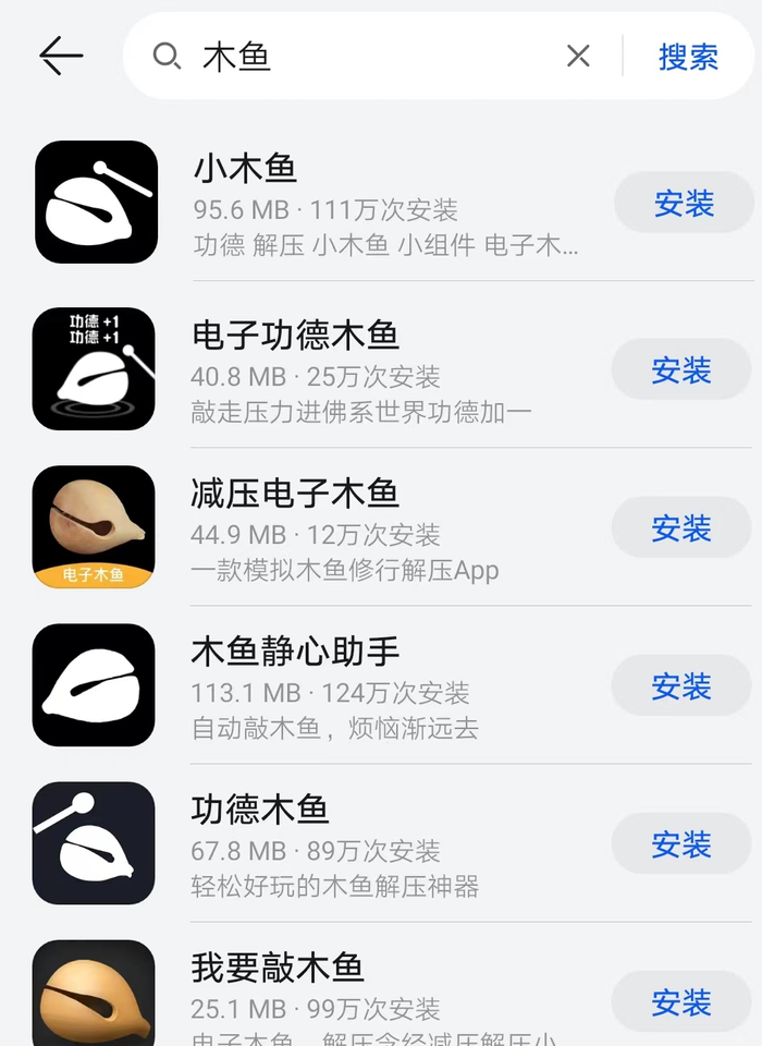 而现在的应用商店里的木鱼APP,下载量靠前的大多也超过100万: