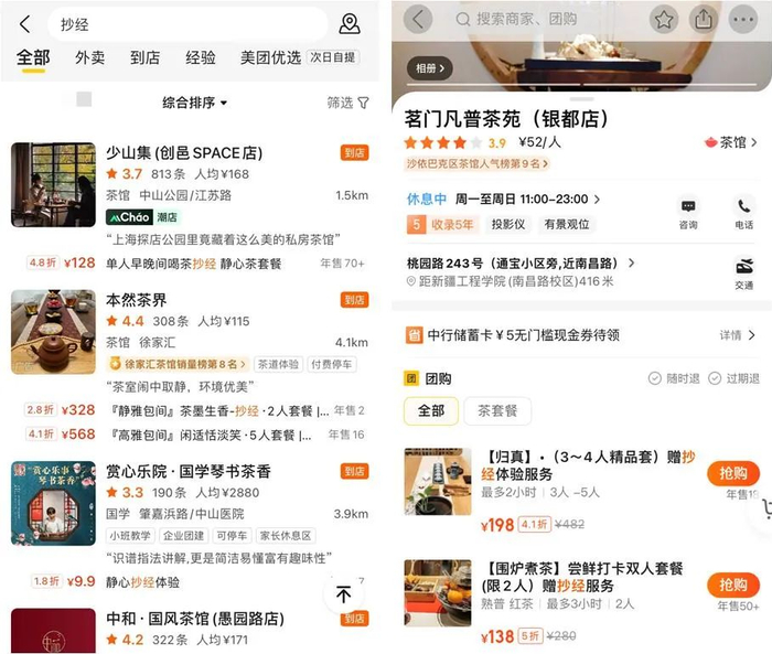 很多平台上,都有安静优雅无人打扰的“抄经小院”,卖“抄经服务”,其实就是提供了一个场地,价格在68-298元不等,可以在那里待上2-3个小时,静心修行。