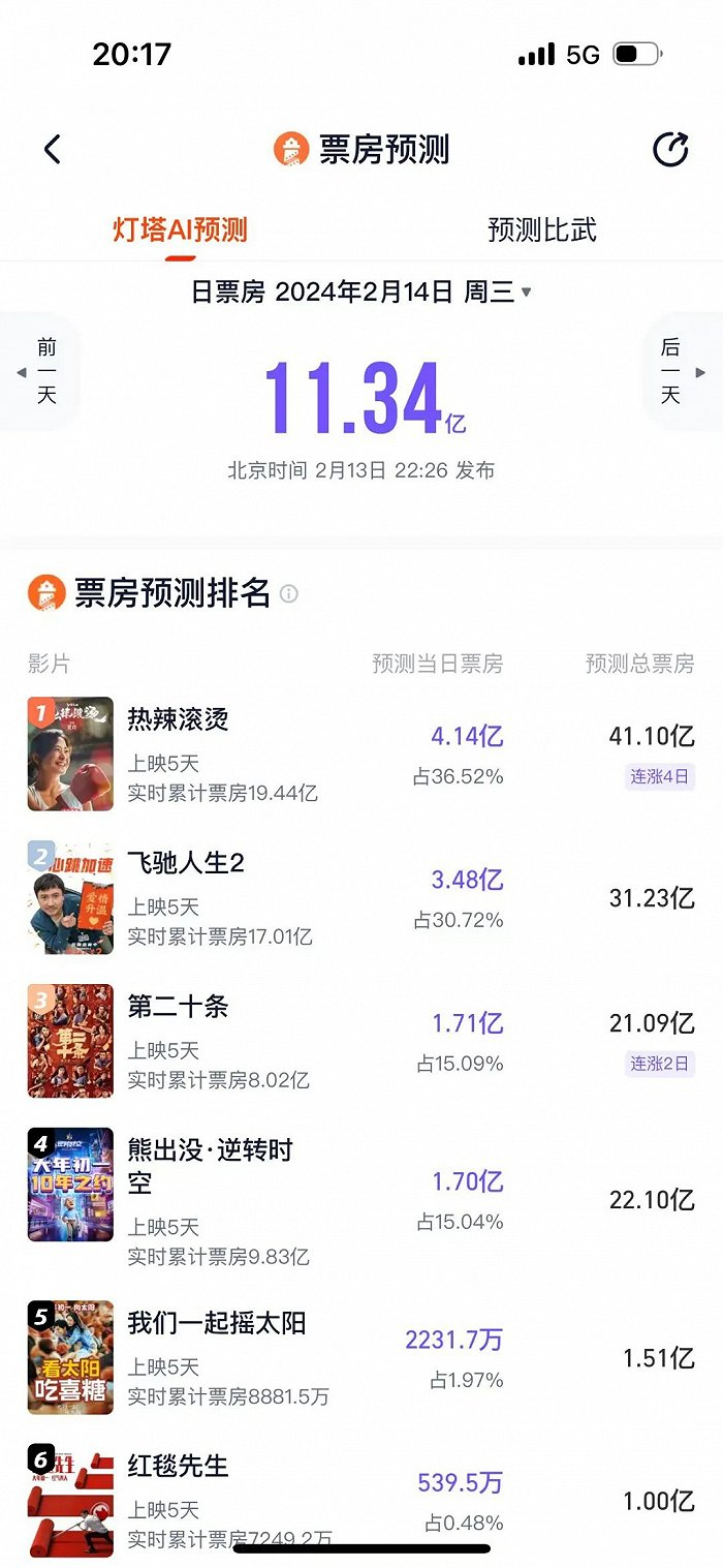 “沈腾+韩寒”“含腾量百分百”的《飞驰人生2》,目前灯塔专业版给出31亿预测,将锁定亚军。一步步成长为最稳大IP的《熊出没·逆转时空》,或将用系列最高票房、档期季军来庆祝这个十周年。张艺谋的《第二十条》映前被视为第一梯队,目前票房占比、排片占比落后至第四。除开两部炮灰动画电影《八戒之天蓬下界》《黄貔:天降财神猫》之外,《红毯先生》《我们一起摇太阳》垫底。《我们一起摇太阳》上映五天后宣布撤档,目前票房接近9000万,位列春节档第五名。