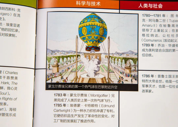 比如在18世纪晚期的科学与技术中,会看到蒙戈尔费埃兄弟的第一个热气球在巴黎升空。