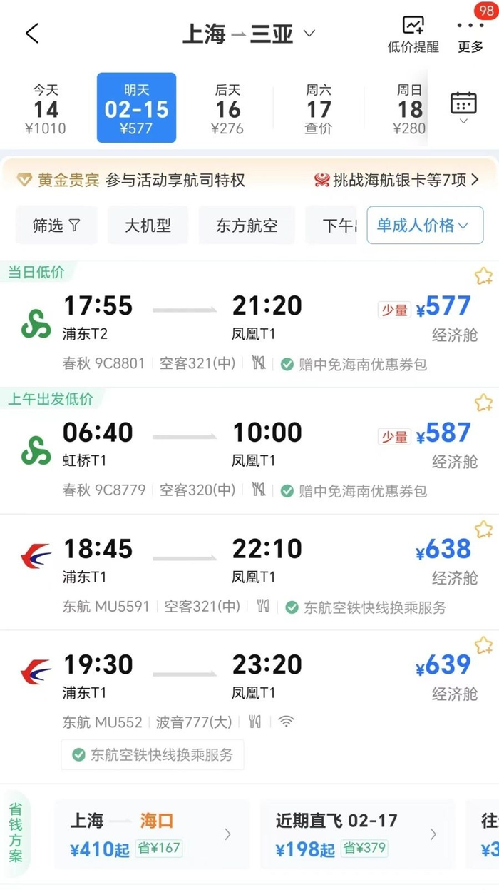 另据了解,2月16日、17日返程高峰期,从上海返回长沙、郑州、三亚等地还有1-2折低价机票;从杭州返回武汉、郑州、长春、西安等地还有2-4折低价机票。由于假期返程高峰期价格变动较快,行业人士提醒消费者及时关注价格变动,提早规划行程。