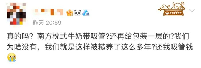 “南方真的牛奶带吸管吗?还我吸管钱。”