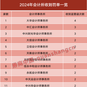 单以机构收到的罚单计,被罚次数居前的会计所是大华会计所、中汇会计所、中兴财光华会计所。前一家被罚4次,后两家均被罚3次。