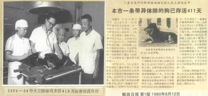 上世纪80年代初,在进行的狗左全肺移植动物实验中,移植狗术后最长存活达723天,为国内之最长。这些实验的成功也为后来上海市肺科医院成功地在人体上进行肺移植打下了坚实的基础。