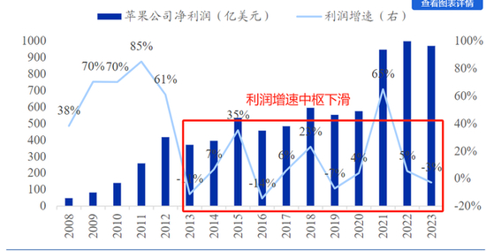 比较有意思的是,苹果从2013年开始,利润增速中枢就在不断下移。