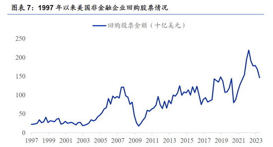 截至2023年二季度,2010年以来美国非金融企业回购股票累积接近6万亿美元(40万亿人民币),而2022年年底美股上市公司总市值大概为52万亿美元。