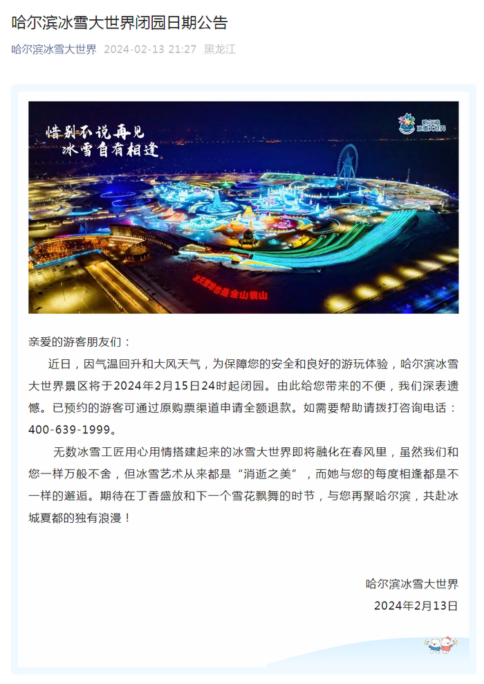 2月13日,哈尔滨冰雪大世界发布闭园日期公告。因气温回升和大风天气,哈尔滨冰雪大世界景区将于2024年2月15日24时起闭园,已预约的游客可通过原购票渠道申请全额退款。