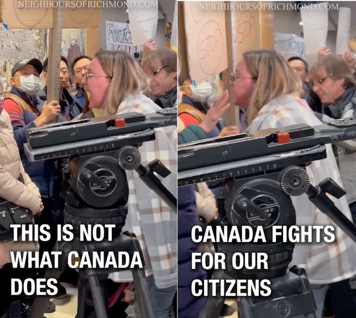 12日晚,支持和反对的双方在市政厅外起了口角冲突,一名白人女子极其嚣张,对华人群体大喊,“你们就是加拿大犯下的错误,回你的家乡去。”“你们不属于这里,回香港去。”