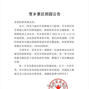 记者从中国雪乡景区了解到,近日,受气温回升和极端天气影响,景区冰雪景观出现不同程度融化,路面结冰存在交通隐患。为保障游客的人身安全,雪乡景区将于2月15日24时起闭园。