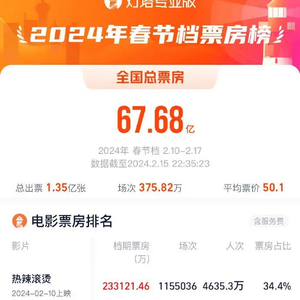 据网络平台数据显示(灯塔专业版数据),2024春节档票房超过去年(67.66亿),进入中国影史春节档票房前二!《热辣滚烫》《飞驰人生2》《熊出没·逆转时空》暂列2024春节档票房前三位。