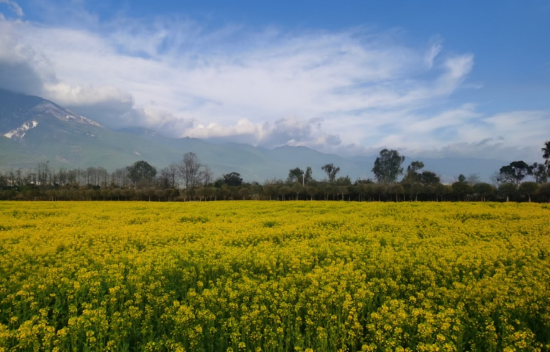除了“江湖气”的大理,大理风花雪月的浪漫也处于这座城市的每一处,下关风、上关花、苍山雪、洱海月,这是我第一次了解风花雪月到底指的是什么。这次虽然没有真切体会到真正的风花雪月,但路上的油菜花也是一道别致的风景。在去往喜洲古镇的路上,突然路过一片油菜花,春天是喜洲油菜花盛开的季节,2023年春天大理喜洲有3000多亩油菜花竞相开放,我们有幸提前遇到,便在路边停下车,观赏这苍山下一个村庄旁偷来的春天。