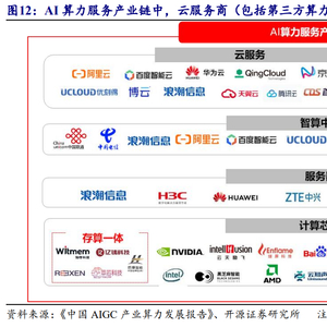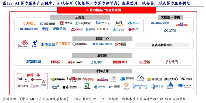 开源证券指出,AI算力服务产业链包括云服务、大模型一体机、智算中心、服务器和计算芯片。