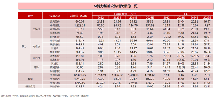 浙商证券张建民2023年11月15日研报指出,建议关注AI产业链算力、数据、应用三件套。算力方面,交换机细分上市公司包括紫光股份、中兴通讯、锐捷网络、菲菱科思和恒为科技;光模块细分包括中际旭创、天孚通信、新易盛和华工科技;光芯片细分包括源杰科技和光库科技;液冷细分包括英维克、高澜股份和网宿科技。数据方面,上市公司包括中国移动、中国联通和中国电信;垂直应用方面,上市公司包括润建股份。