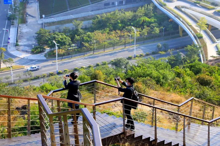 背靠板樟山而建的景山道是全国首条健康智能步道,全长约10.1公里,分为串园段、揽山段和观海段,将城市自然景观巧妙相融,一站式满足揽山、瞰海、观城的需求。
