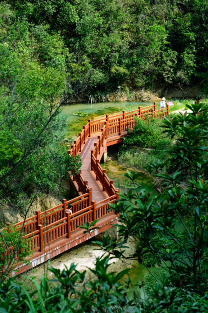公园一期两边步道被7米高的桉树林环绕,从这里出发,向上走500米左右,左转即可进入二期步道。在登山途中还能观赏到“小九寨”景色,灵动的小瀑布和蓝绿色的潭水,与复古的木色栈道、亭台交相辉映,让人忍不住欢呼赞叹。