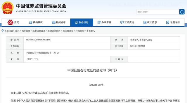 综合相关证据,证监会认为,韩飞的上述行为违反了《证券法》第四十条第一款关于禁止证券公司从业人员直接或者以化名、借他人名义持有、买卖股票的规定,构成《证券法》第一百八十七条所述违法行为。最终,证监会责令韩飞依法处理非法持有的证券,没收违法所得5868.49万元,并处以等额罚款。同时对其采取10年证券市场禁入措施,期间不得继续在原机构或其他任何机构中,从事证券业务、证券服务业务或者担任原证券发行人的董监高职务。