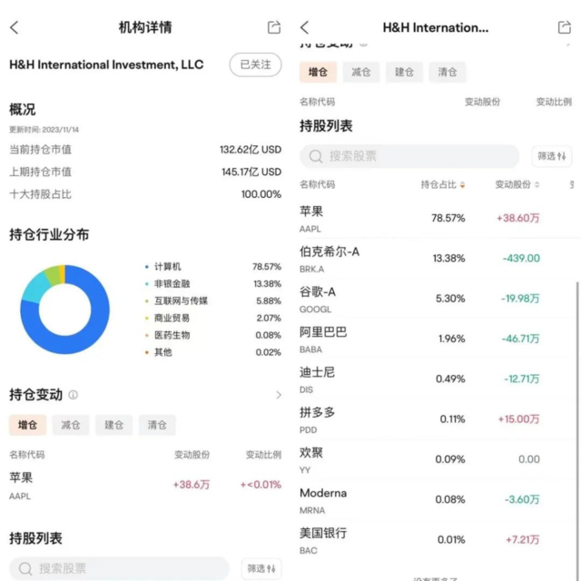 所以截止到这里,验证过程完毕,H&H International Investment, LLC大概率就是段永平在美股的持仓主体。该主体截止到2023年12月31日在美股持有145亿美金股票,其中接近80%仓位是苹果。