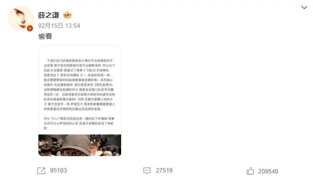 2月16日,@周兆成律师 发文谈薛之谦被指盗摄。律师文中提到:薛之谦的行为是否构成盗摄,需要根据具体情况来判断。
