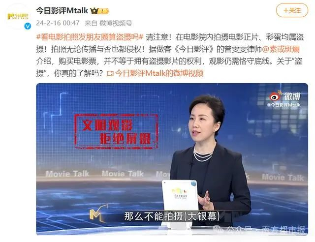 律师指出,在电影院内拍摄电影正片、彩蛋均属盗摄!拍照无论传播与否也都侵权!购买电影票,并不等于拥有盗摄影片的权利,观影仍需恪守底线。