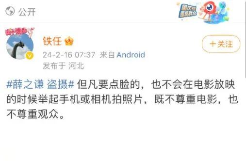 对于电影院拍摄这一行为,有网友称,拒绝摄屏是观影的基本要求,公众人物带头盗摄,确有不妥,“既不尊重电影也不尊重观众”。