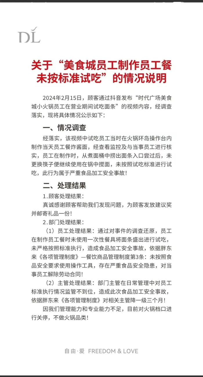 2月16日,胖东来在社交平台发布关于“美食城员工制作员工餐未按标准试吃”的情况说明。全文如下: