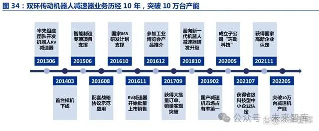双环传动以齿轮制造起家,四十余年深耕中高端齿轮制造领域,主要产品为乘用车齿 轮、商用车齿轮、工程机械齿轮、摩托车齿轮和电动工具齿轮等,并延伸至工业机器人 RV 减速器领域。根据官网介绍,公司从 2013 年开始布局机器人减速器,2020 年国产 RV 减 速器中市占率达到第一名,2022 年 5 月突破 10 万台减速器产能。公司具备数十年的齿轮 加工经验,拥有优质的客户渠道资源和对机器人行业的深刻理解,相比其他汽车齿轮公司 而言,双环更加懂得机器人需要一款什么样的减速器,更能为主机厂客户提供更适合的产 品,反向赋能主机厂,在机器人减速器领域具有更大的潜力。