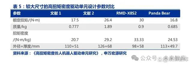 较大的外形尺寸在面向多自由度、小体积仿人机器人应用时会导致关节庞大笨重,严 重影响机器人的运动性能。根据论文《高扭矩密度仿人机器人驱动单元研究》,YU 等设计 了一种用于便携式外骨骼机器人的准直驱驱动单元,扭矩密度为 20.7N·m/kg,外形尺寸为 110mm×51mm。SINGH 等设计的准直驱驱动单元最大扭矩密度高达 29.2Nm/kg·,外形 尺寸 为 126mm× 68mm。 苏 州 脉塔 智 能的 RMD-X8S2 驱 动 单元 扭 矩密 度 高达 33.33N·m/kg,外形尺寸为 98mm×58mm。WestwoodRobotics 的 Panda Bear 型驱动 单元扭矩密度为 24.53N·m/kg,外形尺寸为 113mm×49.7mm。
