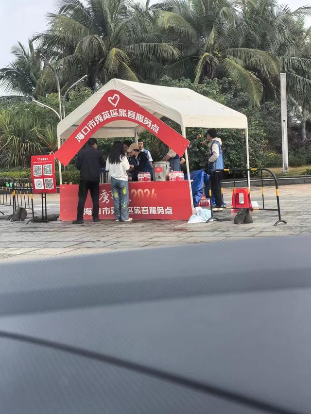 2月16日中午,海口新海港,便民服务点为旅客提供免费的水和饼干。