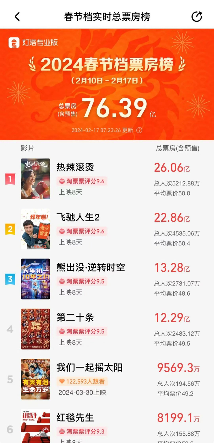 灯塔专业版数据显示,截至发稿,今年春节档总票房76.38亿元,《热辣滚烫》《飞驰人生2》《熊出没·逆转时空》目前位居前三。