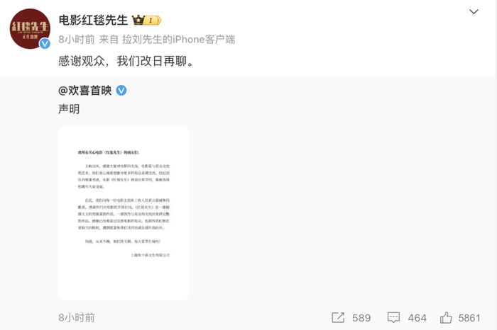 2月16日深夜,欢喜首映发布声明,宣布《红毯先生》将退出春节档。随后,电影《红毯先生》官方微博转发该声明,称“感谢观众,我们改日再聊”。