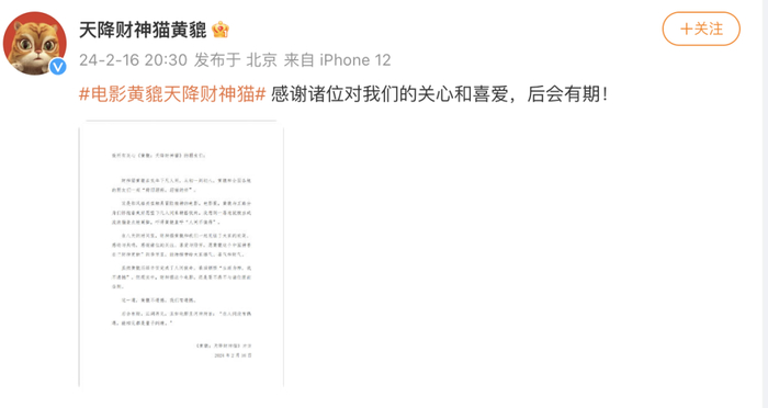 除了《红毯先生》,2月16日晚,电影《黄貔:天降财神猫》也宣布撤档,称“感谢诸位对我们的关心和喜爱,后会有期”。