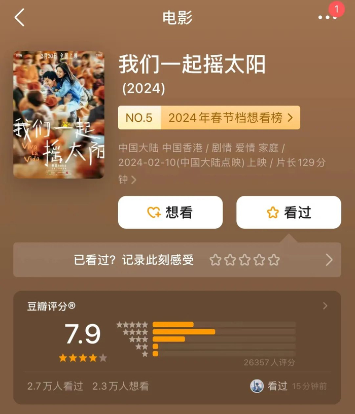 灯塔专业版数据显示,在春节档期间,《我们一起摇太阳》共收获了9569.3万元的票房,豆瓣评分方面,该片获得7.9分。