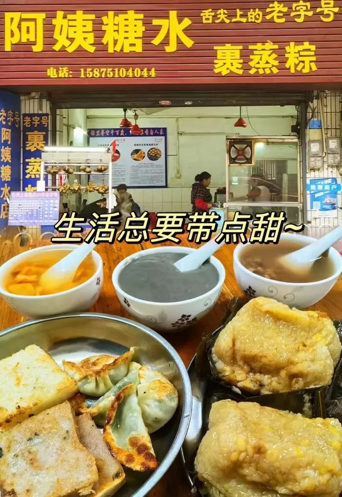 店里主打各式家常糖水,一看到菜单瞬间就馋了,拿起一碗番薯糖水加上一个裹蒸粽,儿时的氛围感就回来了~