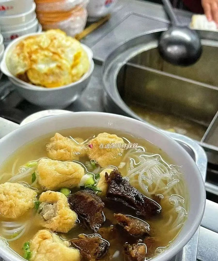 一碗粉里面有牛筋丸、豆腐泡、猪红、瘦肉,加上骨汤,清淡鲜甜又营养丰富。