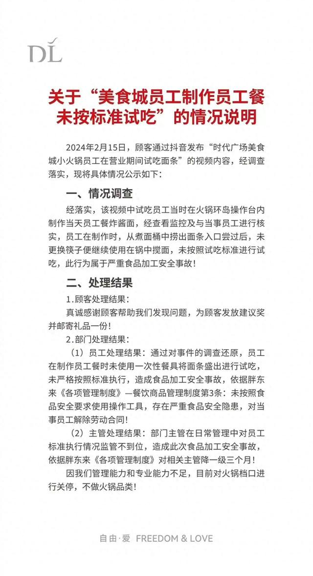 2月16日,胖东来发布关于“美食城员工制作员工餐未按标准试吃”的情况说明,依据胖东来《各项管理制度》—餐饮商品管理制度第3条:未按照食品安全要求使用操作工具,存在严重食品安全隐患,对当事员工解除劳动合同。