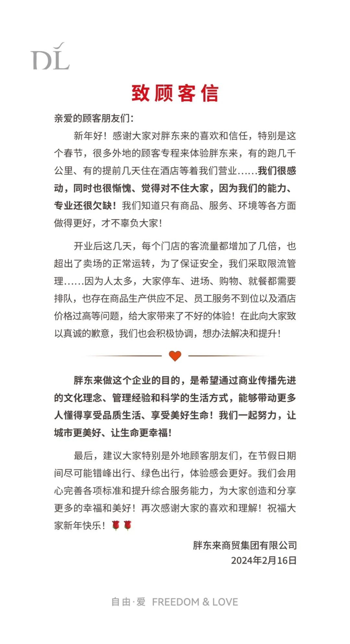 “开业后这几天,每个门店的客流量都增加了几倍,也超出了卖场的正常运转,为了保证安全,我们采取限流管理…因为人太多,大家停车、进场、购物、就餐都需要排队,也存在商品生产供应不足、员工服务不到位以及酒店价格过高等问题,给大家带来了不好的体验!在此向大家致以真诚的歉意,我们也会积极协调,想办法解决和提升!”