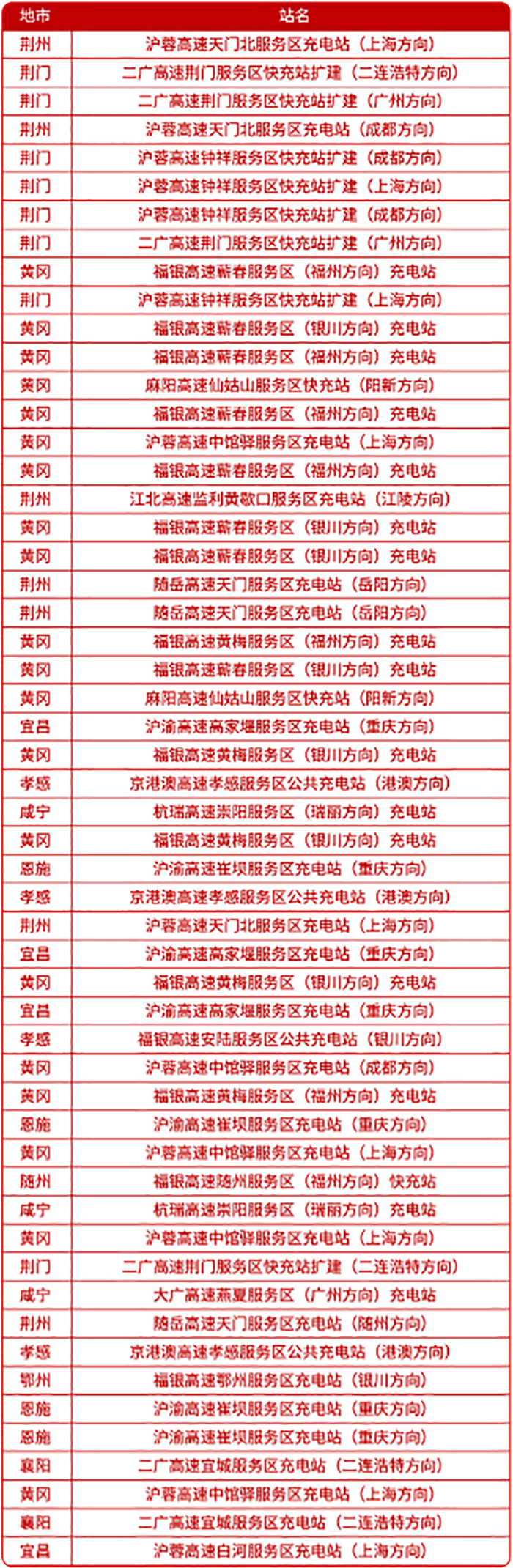 G0421许广高速往湖南方向监利至白螺段;G42沪蓉高速往武汉方向重庆界至兴山段、双莲枢纽至淯溪段、石牌至屈家岭段、京山南至天门北段、应城南枢纽至郎君段、汉川至东西湖段,往安徽方向木子店至安徽界;G4221沪武高速往上海方向汪集至安徽界段;G45大广高速往广州方向星潭枢纽至江西界;G50沪渝高速往上海方向高坪至巴东段、榔坪至贺家坪段、潜江西枢纽至后湖段、排湖至仙桃段、蕲春至武穴段、花桥至黄梅段;G55二广高速往襄阳方向荆州南至荆州桥南段;G56杭瑞高速往九江方向阳新南至枫林段;G7021武阳高速往阳新东枢纽;S29麻阳高速往九江方向阳新东至枫林枢纽。