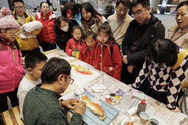 2月15日,北京大运河博物馆,小朋友正在现场观看鱼拓的制作过程。非遗体验项目、国潮文创、传统手工艺体验等丰富多彩的活动,为游客们带来别具一格的新春体验。新京报记者 王子诚 摄