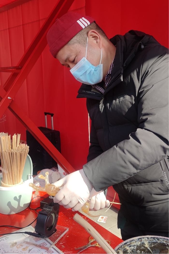 皮影戏是我国一种流传广泛的古老民间戏剧形式,小朋友可以近距离欣赏。在演员的指导下,小朋友还可以体验“小手传承非遗”的乐趣。糖画、糖人,是每年庙会必不可少的“拿手好戏”。今年的大观园庙会,则推出了让孩子自己动手制作的环节,让孩子们在动手、动脑的同时,还能体验到亲手制作传统美食的乐趣。