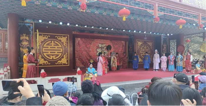 今年的大观园庙会融入了很多传统文化元素,也是北京众多庙会中唯一以“红楼梦”为主题的古典特色庙会。作为庙会的“重头戏”,“元妃省亲”“宝黛成亲”“贾母贺寿”等系列红楼情景剧,再现了家庆团圆的场景。