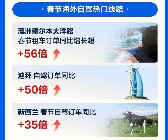 今年春节期间,基督城、墨尔本、迪拜、吉隆坡、洛杉矶、普吉岛、悉尼、曼谷、奥克兰、阿布扎比成海外自驾十大热门目的地;其中澳大利亚墨尔本春节租车订单同比增长超 56倍、迪拜自驾订单同比增长近50倍、新西兰春节自驾订单同比增长35倍以上。