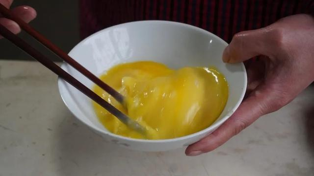 搅拌好的馅料放置在一旁,俞阿姨拿出一个大碗开始准备起另外一个重要的食材鸡蛋。新鲜的鸡蛋打散成蛋液,肉眼观察蛋液没有明显块状就算是搅拌完成了。“鸭蛋可以在制作的时候增加蛋皮的黏度,所以还会在鸡蛋中加入鸭蛋,比例差不多在1:2,为了使蛋饺制作不粘锅,还会在蛋液中滴上几滴食用油。”俞阿姨说起来她多年来的制作小诀窍。