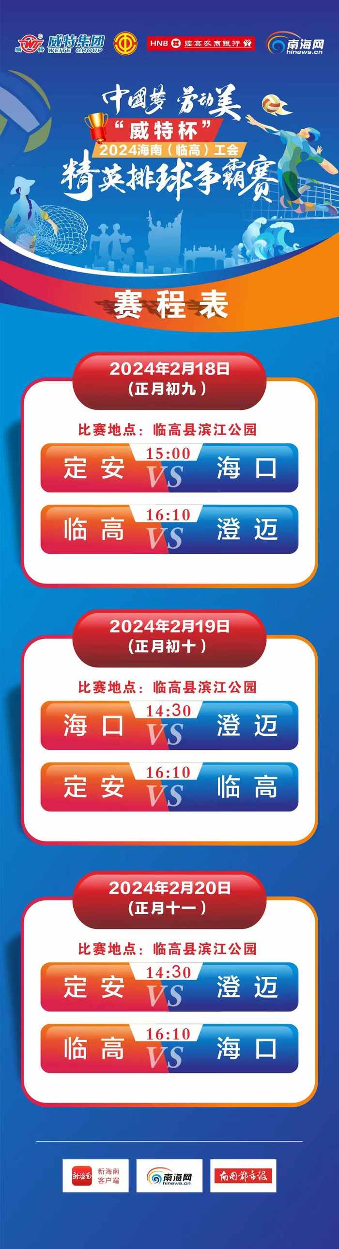 本次临高争霸赛举办时间为:2024年2月18日-2月20日,为期三天。比赛时间为14:00-18:00。此次比赛分别邀请海南岛内临高队、海口队、定安队、澄迈队共4支代表性参赛球队,赛制采用九人制男子排球比赛规则,每场比赛五局三胜,根据总得分最终决出4支球队排名。