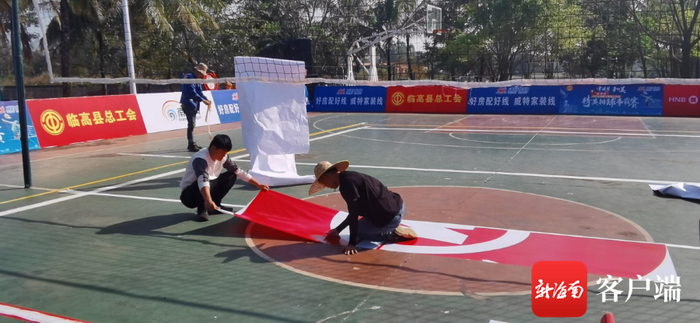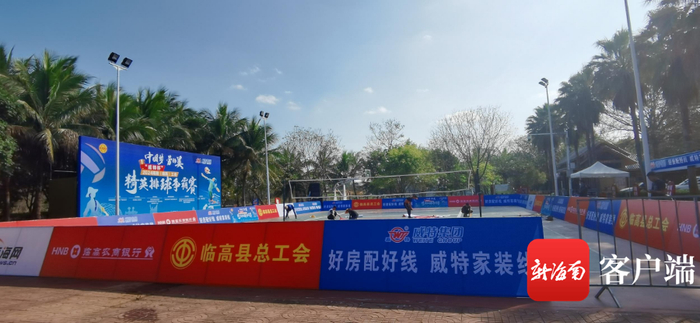 在临高县滨江公园,门口及路边的赛事广告牌让不少市民驻足观看,动感的音乐还吸引市民游客到现场打卡。在比赛场地内,工人正在粘贴的中场LOGO图案,四周的广告牌以及比赛海报,记分牌都摆放整齐,等待比赛的正式开打。“场地布置已经完成,剩下的音响调试,还有彩排正在有序进行中。”现场工作人员介绍。
