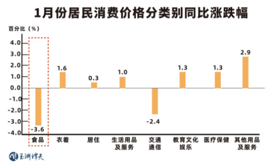 1月份同比出现跌幅的主要集中在食品这一类别,由于食品价格的季节性变化往往比较大,节假日和非节假日的差距也会非常明显。