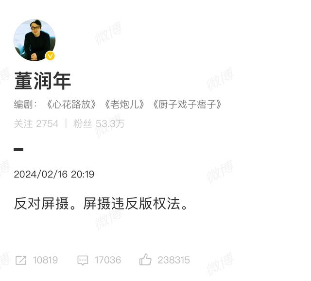 导演董润年在社交平台发文:“反对屏摄。屏摄违反版权法”。